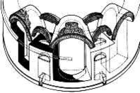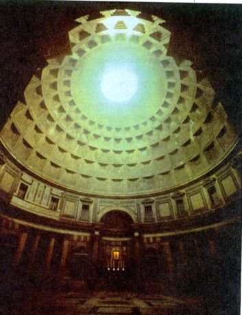 нтерьер Пантеона вызывает чувство покоя и гармонии. Вошедший в храм оказывается внутри грандиозного подкупольного пространства. Гигантские размеры сооружения в соеди- нении с гармоническими пропорциями и благо- родной красотой архитектурных форм создают впечатление исключительной силы. Огромное пространство, огражденное высокой, идущей по кругу стеной с нишами, перекрыто куполом, подобным чаше, опрокинутой над головой, или небесному своду. Через большое круглое отверстие в центре купола в храм проникают лучи солнца, виднеется голубое небо. Воспринимаемый как своеобразное подобие небесного свода, громадный купол, господствующий над обширным пространством ротонды,— такова образная и композиционная тема, призванная воплотить идею сооружения храма, посвященного не одному божеству, а всем богам.