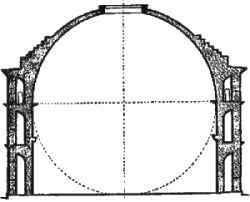 одной средневековой легенде рассказывалось, что этот гигантский купол был построен на огромной куче мусора, нагроможденной внутри барабана. А чтобы эту кучу быстро разгребли, когда купол будет завершен, Адриан будто бы велел разбросать под ней куски золота. Та строительная техника, которая применялась в действительности, отличалась не меньшей хитроумностью: вокруг деревянных кессонных форм постепенно заливались слои бетона. Стена ротонды состоит из восьми опор — пилонов, соединенных арками. В стене много скрытых с помощью облицовки пустот и ниш. Один из пролетов арки служит входом в храм. Чтобы приглушить впечатление громоздкости и тяжести сооружения, мастер расчленил стену снаружи на три пояса по горизонтали. Портик с двумя рядами колонн по восемь выглядит как преддверие храма — пронаос. Внушительные монолитные колонны без каннелюр высечены из красного египетского гранита, а их капители и базы — из греческого мрамора. Своим великолепием портик маскирует тяжелый цилиндр храма. Сильно выступая на маленькую площадь перед Пантеоном, он кажется особенно большим и скрывает за собой колоссальную массивную ротонду храма
