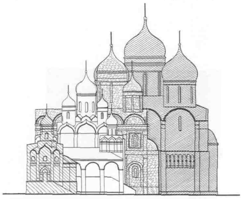 Сравнение планов кремлевских соборов показывает, что они последовательно отличались друг от друга на удвоенную толщину стены, то есть могли быть как бы «вписаны» один в другой (внешние габариты меньших из них оказывались соответствующими интерьерным размерам больших). Обращает на себя внимание также определенное соответствие по общим размерам и высоте расположения центральных глав меньших церквей боковым главам церквей больших. Силуэт Архангельского собора вместе с центральной главой графически накладывается на очертания малых глав Успенского собора. Малые же главы Архангельского собора находят себе соответствие в центральной главе Благовещенского собора. Были, наверное, в Кремле и церкви, соответствовавшие масштабу боковых глав Благовещенского собора. Церковь Ризоположения находит свой масштабный аналог в придельных церквах, сооруженных над папертью Благовещенского собора во второй половине XVI в. Благодаря такого рода размерным соотношениям в ансамбле Московского Кремля достигался особый эстетический эффект плавного нарастания масштабов родственных по своим общим формам архитектурных сооружений от второстепенных к главному. Меньшие главы соборов играли роль связующих звеньев в этой иерархической последовательности. Вообще, подобные и разномасштабные главы, парившие над городом, имели большое самостоятельное значение и, вызывая определенные ассоциации со звоном разноголосых колоколов, во многом способствовали созданию как бы пульсирующего и вместе с тем исключительно целостного архитектурного ансамбля.