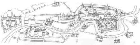 Сложная пространственная структура древнерусского города обусловливалась, таким образом, с одной стороны, разномасштабностью, дробностью застройки, которая никогда не сливалась в сплошной массив, а с другой — различной функциональной и идейно-символической значимостью городских участков.