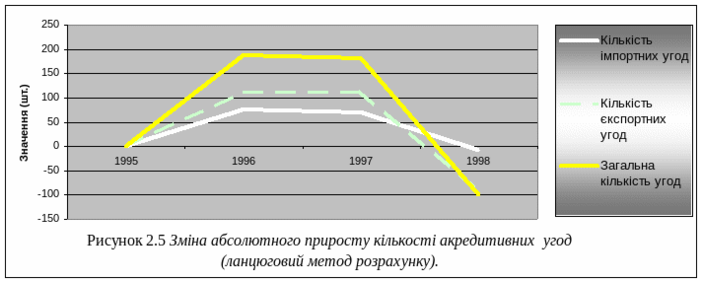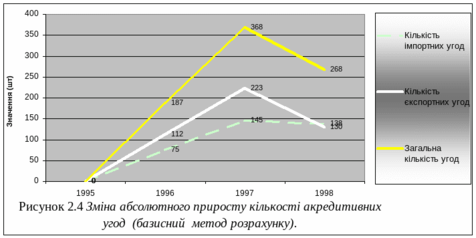 Розглянемо як змінювалася кількість експортних акредитивних угод на протязі досліджуваного періоду. Абсолютний приріст кількості експортних акредитивних угод за 1996 рік в порівнянні з 1995 становить 112 акредитивних договорів. Якщо порівнювати його із значенням абсолютного приросту імпортних акредитивних угод за той самий період, то він на порядок більший (112-75=37). Це свідчить про те, що швидкість з якою зростала кількість експортних акредитивних угод в 1996 році була більшою, ніж швидкість зростання імпортних акредитивних угод. Це підтверджує і показник абсолютного приросту кількості експортних акредитивних угод за 1997 рік, який становить 223 угоди (в порівнянні з 1995). Абсолютний приріст кількості експортних акредитивних угод за 1997 рік в порівнянні з 1996 роком становить 111 угод, що лише на 1 менше такого ж показника за 1996 рік (111-112= -1). Це свідчить про те, що кількість угод на яку збільшилася кількість експортних акредитивних угод за 1997 рік, майже не зменшилася. Іншими словами швидкість з якою зростала кількість експортних акредитивних операцій в 1997 році майже залишилася баз змін. Особливо чітко це видно на рисунках 2.3 та 2.4. Однак ця тенденція змінюється не в кращу сторону в 1998 році. Так абсолютний приріст імпортних акредитивних операцій в порівнянні з 1995 роком становить 130 договорів. Це значення значно менше ніж значення показника у 1998 році. Це підтверджує абсолютний приріст експортних акредитивів за 1998 рік, розрахований за допомогою ланцюгового методу розрахунку (показник дорівнює “-93”).