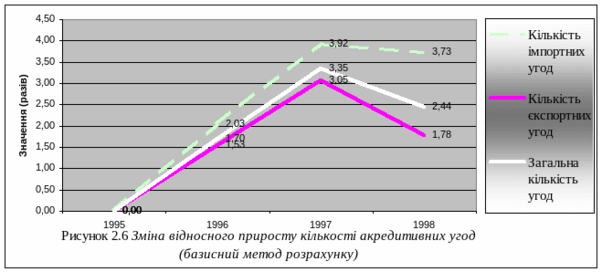 Розглянемо як змінювалася загальна кількість акредитивних угод на протязі досліджуваного періоду. Абсолютний приріст загальної кількості акредитивних угод за 1996 рік в порівнянні з 1995 становить 187 акредитивних договорів. Абсолютний приріст загальної кількості акредитивних угод за 1997 рік в порівнянні з 1995 роком становить 368 угод; в порівнянні з попереднім 1996 роком 181 угода. Іншими словами швидкість з якою зростала кількість акредитивних операцій в 1997 році в порівнянні з 1996 майже залишилася баз змін. Однак ця тенденція змінюється не в кращу сторону в 1998 році. Це є прямим наслідком негативної зміни кількості експортних та імпортних акредитивних угод. Отже абсолютний приріст загальної кількості акредитивних угод за 1998 рік в порівнянні з 1995 становить 268 угод, що на 100 угод менше ніж приріст загальної кількості акредитивних угод в 1997 році. Таке падіння значення абсолютного приросту лише доказує негативний вплив Східно-Азіатської, та Російської кризи на кількість акредитивних угод здійснених в банку “Фінанси та кредит” на протязі 1998 року. Однак не дивлячись на всі ці негаразди слід таки відзначити, що хоча кількість акредитивних угод в банку “Фінанси та кредит” почала падати, це падіння не є обвальним або різким.