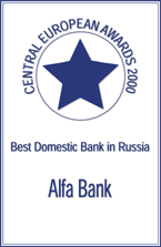 | Журнал Central European удостоил Альфа-банк звания «Лучший банк России 2000 года» во многом благодаря тому обстоятельству, что банку удалось увеличить свой основной капитал с 50 млн долл. (на конец 1998 года) до 200 млн долл. (на конец 1999 года). В июне 2000 г. Euromoney назвал Альфа-Банк «Банком, наиболее заслуживающим доверия». |