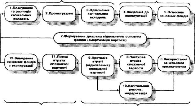 Рис. 2. Стадії та етапи циклу відтворення основних фондів торговельного підприємства