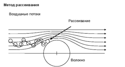 Метод рассеивания работает при фильтрации маленьких и легких частичек. Маленькие частички находятся в постоянном движении и могут хаотично менять воздушные потоки. По мере приближения к волокну возрастает активность рассеивания и возрастает вероятность прикосновения к волокну. Аналогия из практики автомобильного транспорта: пьяный водитель движется в одном направлении, но периодически переходит с одной полосы на другую. Его шансы встретиться с препятствием сильно возрастают.