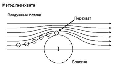 Метод перехвата – единственный механизм, при котором частички не отклоняются от, несущих их воздушных потоков. По мере того, как воздушные потоки приближаются к волокну, происходит их разделение и компрессия с последующим восстановлением после прохождения волокна. Если частичка, движущаяся по таким воздушным потокам, приближается к поверхности волокна на расстояние ее радиуса, частичка поймана. Чем больше размер частички, тем больше вероятность ее задержания. Используя автомобильную тематику, можно это описать следующим образом: грузовик, везущий негабаритный груз, пытается поменять полосу, но его широкий груз цепляет препятствие.