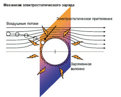 Эффективность фильтрующего материала может быть увеличена с помощью применения ПОСТОЯННОГО ЭЛЕКТРОСТАТИЧЕСКОГО ЗАРЯДА волокон. В механических фильтрах используется энергия самих аэрозольных частичек для их фильтрации. Электростатические силы заряженных волокон заставляют частички отклоняться от их воздушных потоков и притягивают их к волокнам. Электростатический заряд позволяет использовать меньше фильтрующего материала для достижения того же уровня эффективности, что и у эквивалентного механического фильтра. Что сказывается на уровне сопротивления дыханию.