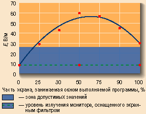 Результаты измерений - на графике справа. Хорошо видно, что при переходе от полноэкранного изображения, используемого при испытаниях (точка 0% по горизонтальной оси графика), к оконному режиму, соответствующему реальным условиям работы современного пользователя (значения 25-100% на горизонтальной оси), излучение монитора (темно-синяя линия на графике) выходит далеко за допустимые пределы (светло-синяя область).