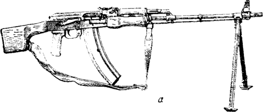 Из автомата (пулемета) ведется автоматический или одиночный огонь. Автоматический огонь является основным видом огня: он ведется короткими (до 5 выстрелов) и длинными (из автомата—до 10 выстрелов, из пулемета—до 15 выстрелов) очередями и непрерывно. Подача патронов при стрельбе производится из коробчатого магазина емкостью: у автомата—на 30 патронов, у пулемета — на 45 патронов. Магазины автомата и пулемета взаимозаменяемы.