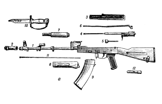 Комплект входит: автомат, 4 магазина, штык-нож, инструмент для частичной разборки и чистки, шомпол, масленка, ремень переносной, чехол, руководство по эксплуатации.