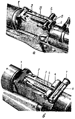 Рис. 4. Прицел: а — автомата; б — пулемета; 1 — колодка прицела; 2 — сектор; 3 — прицельная планка; 4 — хомутик; 5 — гривка прицельной планки; 6— защелка хомутика; 7— маховичок винта целика; 8 — целик.