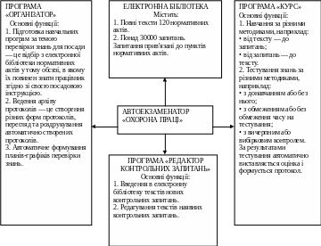 автоекзаменатор «Охорона праці» забезпечує міцне засвоєння працівником правил та інструкцій. Використання цього програмного комплексу допомагає працівникам швидше вивчити нормативні акти і краще їх запам'ятати;