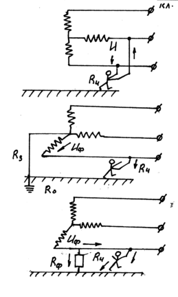 однофазное с изолированной нейтралью (до 1 кв, где емкостным сопротивлением сети можно пренебречь)