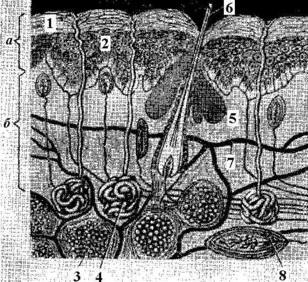 5 — сальные железы; 6 — волос; 7 — кровеносные сосуды; 8 — чувствительные нервные окончания