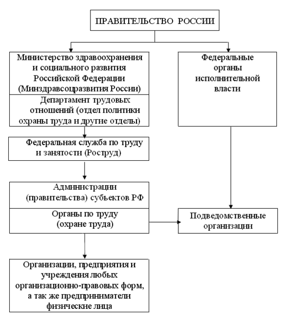 В соответствии с Трудовым кодексом Российской Федерации государственное управление охраной труда осуществляется Правительством РФ непосредственно или по его поручению федеральным органом исполнительной власти по труду, другими федеральными органами исполнительной власти, а также органы исполнительной власти субъектов Российской Федерации.