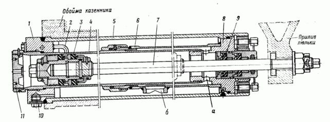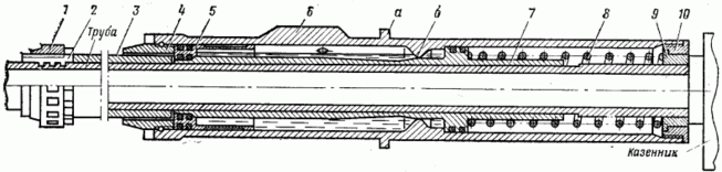 На трубе имеются кольцевые проточки. На эту часть трубы надето разрезное кольцо 2, на которое навинчена гайка 1. Эти детали создают искусственный бурт для передачи силы отдачи через втулку 3 на детали, заключенные внутри наружного цилиндра 6. Цилиндр 6 спереди и сзади закрыт гайками 4 и 10.
