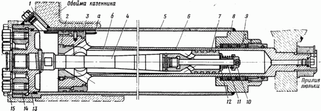 Тормоз отката (рис. 13) состоит из цилиндра 5, заполненного тормозной жидкостью стеолом М, и размещенных внутри него штока 6 с поршнем и регулирующим кольцом 2 и веретена 4 с модератором 7. Цилиндр 5 вставлен в обойму казенника; передний конец штока 6 закреплен в приливе люльки. К передней части цилиндра 5 приварен корпус 8 уплотнения. Уплотнение состоит из нескольких слоев асбестовой набивки 9 и нескольких ромбовидных колец, поджатых гайкой. В казенную часть цилиндра 5 вставлена задняя крышка 13 с веретеном 4 и ввинчена гайка 14 цилиндра. Медное уплотнительное кольцо между задней крышкой 13 и цилиндром 5 поджимается с помощью болтов 15. Сверху к цилиндру 5 приварена бонка 1 с пробкой, которая позволяет производить проверку уровня жидкости в тормозе отката. Сверху на внутренней поверхности цилиндра 5 (в некоторых конструкциях—на рубашке поршня) имеются проточки а для выхода воздуха из предпоршневой полости при заливке жидкости.