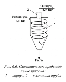 На рис. 6.56 изменение направления движения газа достигается с помощью перегородки. При этом частицы пыли по инерции направляются вниз, а очищенный газ выводится сверху.