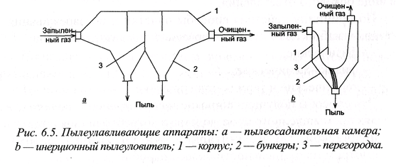 При размерах частиц пыли 25-50 мкм и высоких их концентрациях в газовом потоке (более 50 г/м3) обычно используют пылеосадительные камеры и инерционные пылеуловители (рис. 6.5).