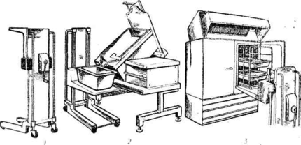 1 — нізок ТП-80 з підйомною платформою; 2 — розвантаження електросковороди; 3 — завантажения пароварильного апарату.