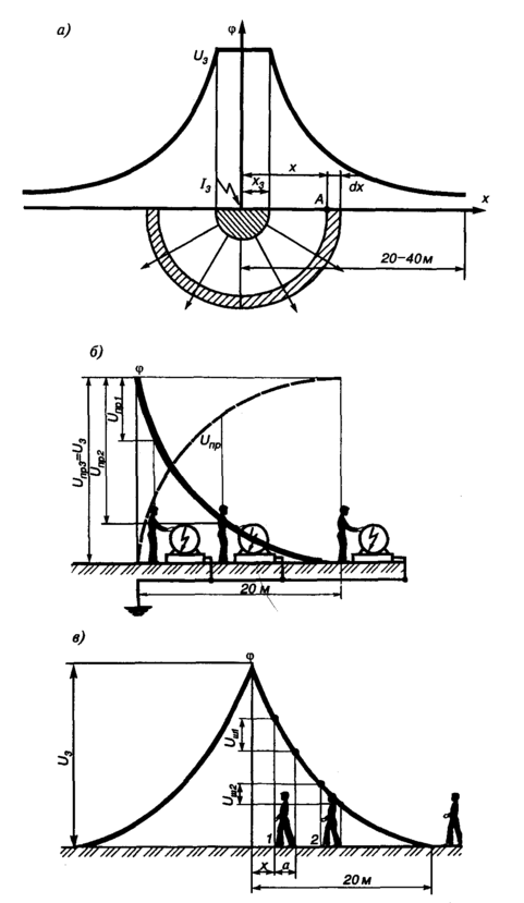 Напряжение шага - это напряжение между точками земли, обусловленное растеканием тока замыкания на землю при одновременном касании их ногами человека. Численно напряжение шага равно разности потенциалов точек, на которых находятся ноги человека (рис.3.16, в).