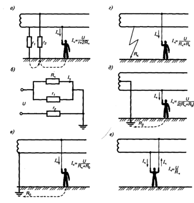 а - схема прикосновения к проводу изолированной сети; б - эквивалентная схема; в - схема прикосновения к незаземленному проводу сети с заземленным полюсом; г - схема прикосновения к проводу неисправной сети; д - схема прикосновения к проводу сети с заземленной средней точкой; е - схема прикосновения к двум проводам сети