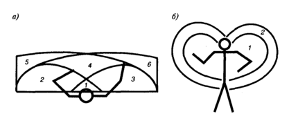Правильное конструирование рабочих зон определяется соответствием их с оптимальным полем зрения рабочего и определяется дугами, которые может описать рука, поворачивающаяся в плече или в локте на уровне рабочей поверхности (т.е. учитывая динамические АХ), а движением рук управляет мозг человека в соответствии с коррекцией глаз. Поэтому рабочую зону, удобную для действия обеих рук, нужно обязательно совмещать с зоной, удобной для охвата человеческим взором. На рис. 2.9 представлены структурные схемы рабочих зон: а — при позе «сидя» в горизонтальной плоскости; б — при позе «стоя» в вертикальной плоскости.