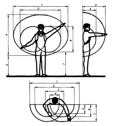 Динамические АХ используются для определения объема рабочих движений, зон досягаемости (табл. 2.5, рис. 2.7) и видимости, по ним рассчитывают пространственную организацию рабочего места.