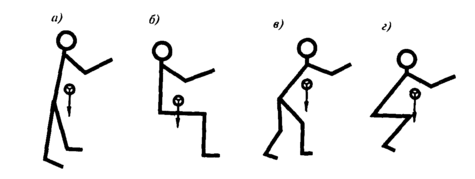 Следует отметить, что (рис. 2.8, а, в) поза «стоя» требует больших энергетических затрат и менее устойчива из-за поднятого центра тяжести. Поэтому в этой позе быстрее наступает утомление.
