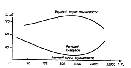 Пользование шкалой децибел удобно, так как почти весь диапазон слышимых звуков укладывается менее чем в 140 дБ (рис. 2.13).