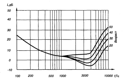 Минимальный уровень определенного звука, который требуется для того, чтобы вызвать слуховое ощущение в отсутствие шума, называют абсолютным порогом слышимости. Значение его зависит от тона звука (частота, длительность, форма сигнала), метода его предъявления и субъективных особенностей слухового анализатора оператора. Абсолютный порог слышимости имеет тенденцию с возрастом уменьшаться (рис. 2.14).