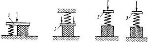 ис. Схемы пружинно-резиновых амортизаторов: 1 – резина; 2 – стальная пружина; 3 – опора виброизолированной машины.
