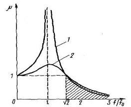 Следовательно, для достижения малого значения коэффициента передачи необходимо, чтобы частота собственных колебаний была значительно меньше частоты вынужденных колебаний. При f=f0 наступает резонанс - резкое увеличение интенсивности колебаний виброизоляционной машины (при частоте собственных колебаний близкой к частоте вынужденных колебаний применение виброизоляторов бесполезно), при f/ f0 >2 резонансные колебания исключаются, а при f/f0=3-4 достигается эффективность работы виброизоляторов.