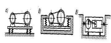 Рис. Схемы виброизоляции виброактивного оборудования: а – опорный вариант; б – подвесной вариант; в – виброизоляция от вертикальных и горизонтальных колебаний.