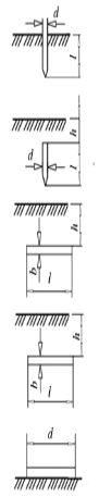 | | Труба, стержень у поверхности земли Труба, стержень на глубине h'; h= h'+1/2 Протяженный за-землитель (полоса, труба) на глубине А, ширина b Кольцевой зазем-литель (полоса, труба) на глубине h Круглая пластина на поверхности земли (диаметр d) | |