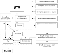 Целями автотехнической экспертизы являются установление технического состояния транспортных средств дорожных знаков и разметок, механизма дорожно-транспортного происшествия. Объектами исследования автотехнической экспертизы являются: само место ДТП, транспортные средства и их части (узлы, детали, обломки): автомобили, мотоциклы, мотороллеры, велосипеды, мопеды, автобусы, троллейбусы, трамваи, тракторы, иные самоходные механизмы. Судебными доказательствами считают любые фактические данные, на основе которых в определенном законом порядке органы дознания, следователь и суд устанавливают наличие общественно опасного деяния, виноватость лица, совершившего это деяние, и другие обстоятельства, имеющие значение для правильности решения дела. К таким доказательствам относятся: показания свидетелей, обвиняемого, потерпевшего, заключение эксперта, вещественные доказательства, протоколы следствия и судебных действий. Заключение эксперта является важнейшим средством доказывания в делах об автотранспортных преступлениях. Оно содержит доказательственную информацию. Ее получают путем проведенных на основе научных данных исследований, а также фактических обстоятельств, зафиксированных в уголовном деле. Исследуя поставленные доказательства, эксперт в соответствии с поставленными перед ним задачами устанавливает другие доказательства по делу, используя при этом специальные познания. Таким образом, доказательственная информация, устанавливаемая судебной экспертизой, является результатом обобщающего познавательного процесса и носит характер вывода. Исследование механизма ДТП должно приводиться комплексно, чтобы каждое звено, "следствие - экспертиза - суд -прокуратура имело одну цель - объективное восстановление обстоятельств ДТП, выявление истинного виновника в случившемся и вынесение по факту ДТП объективного решения в соответствии с действующим законодательством. На рисунке 1 показаны связи отдельных звеньев систем «следствие – экспертиза - суд» при расследовании ДТП, при этом расследование находится под контролем прокуратуры. Определенное место в этой деятельности может занимать судебная экспертиза. Современная судебно-автотехническая экспертиза относится к инженерно-транспортным экспертизам. Различают пять видов экспертиз: различных видов ДТП; следов на месте ДТП и повреждений на транспортных средствах; технического состояния транспортных средств; инженерно-психофизиологическая экспертиза участников ДТП; дорожных условий и окружающей среды.