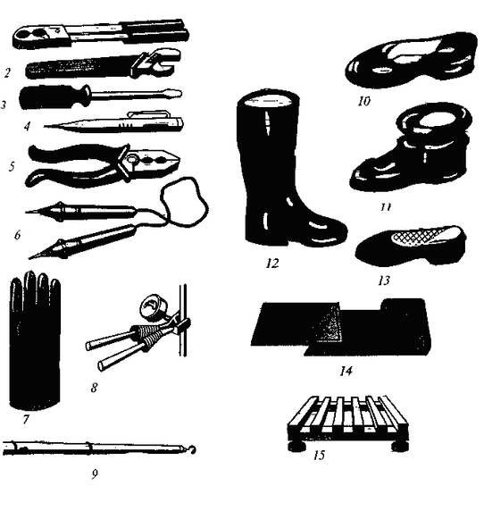 а – основные; б – индивидуальные; 1 – клещи для вставки предохранителей; 2 – гаечный ключ; 3 – отвертка; 4, 6, 9 – указатель напряжения; 5 – пассатижи; 7 – перчатки резиновые диэлектрические; 8 – токоизмерительные клещи; 10, 11 – галоши и боты диэлектрические; 12 – сапоги диэлектрические; 13 – туфли антистатические; 14 – резиновый коврик и дорожка; 15 – изолирующая подставка.