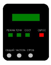 Цвет корпуса частотомера - черный, надписи - белые. Индикатор зеленого цвета свечения, для увеличения контрастности и различимости символов закрывается прозрачным светофильтром из оргстекла зеленого цвета. Кнопки “РЕЖ” (режим), “ТОЧН” (точность) и “СОСТ” (состояние), управляющие режимами измерений, также выполнены зелеными, т.к. этот цвет рекомендуется для индикаторных и других устройств, сигнализирующих о нормальном режиме работы. Отдельно вынесенная кнопка “СБРОС” - красного цвета, рекомендованного для отключающих и аварийных устройств.
