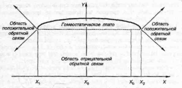 Область Х1-X2- эта область гомеостаза. Часть этой области с относительной постоянной функцией называется гомеостатическим плато. Оно, как правило, более выпукло у биологических объектов низшего иерархического уровня. Кроме, того это плато в действительности представляет собой несколько «размытую» область, так как оптимальные параметры биологического объекта (Y) не строго постоянны во времени, а колеблются в определенных пределах. Вне области Х1-Х2 значение Х0 – это значение Х, характерное для нормального функционирования объекта. Значения Х1 и Х2 называются критическими (пороговыми) значениями Х. область гомеостаза – это область отрицательной обратной связи, так как организм работает в сторону возвращения системы в исходное (стационарное) состояние. При сильных нарушениях гомеостаза объект может перейти в область положительной обратной связи, когда изменения, вызванные воздействием вредных веществ, могут стать необратимыми, и объект все дальше и дальше будет отклоняться от стационарного состояния.