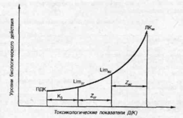 ПДКр.з устанавливается на ровне 2-3 раза и ниже, чем порог хронического действия Limcr. Такое снижение называется коэффициентом запаса (К3). Взаимосвязь токсикологических параметров химического вещества представлена на рис. 2.