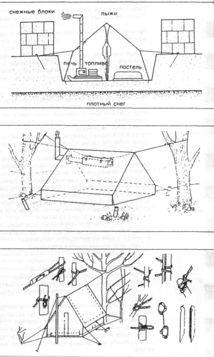 В условиях многоснежной зимы спасатели должны уметь устраивать укрытия в снегу. Самое простое из них - яма, вырытая вокруг дерева, размеры которой зависят от количества людей. Сверху яму необходимо закрыть ветками, плотной тканью, засыпать снегом для лучшей теплоизоляции. Можно построить снежную пещеру, снежную землянку, снежную траншею. При входе в снежное убежище следует очистить одежду от снега и грязи, взять с собой лопату или нож, которые могут быть использованы для проделывания вентиляционных отверстий и прохода в случае обрушения снега.