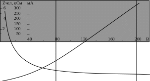 исунок 3.3.1 - Зависимость сопротивления тела человека и тока, проходящего через него, от величины приложенного напряжения