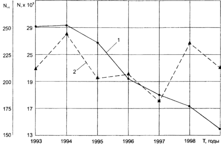 Динамика общего (1) и смертельного (2) травматизма представлена на рис. 4.1.1. На две особенности динамики следует обратить внимание.