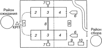 Условные обозначения: 1 - место приема документов и ценностей; 2 - раздевальное отделение; 3 - обмывочное отделение; 4 - одевальное отделение; 5 - место выдачи документов и ценностей; 6 - ДДА; 7 - водосборный колодец; 8 - водоотводная канава; 9 - склад чистой одежды; 10 – врачи.