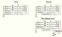 Также можно наблюдать систему TN-C-S, где разделение нулей происходит в середине линии, однако, в случае обрыва нулевого провода до точки разделения, корпуса окажутся под линейным напряжением, что будет представлять угрозу для жизни при касании.