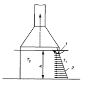 где Q — количество конвективного тепла, Вт; F — площадь горизонтальной проекции поверхности источника тепловыделений, м2; Н — расстояние от источника тепловыделений до кромки зонта, м.
