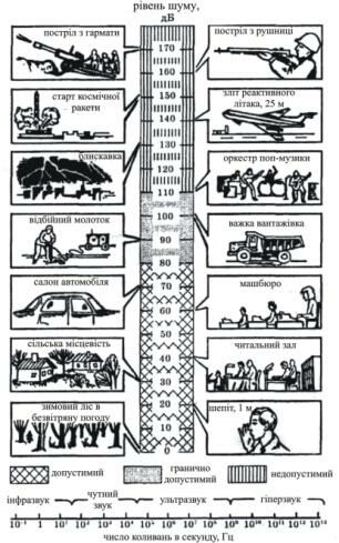 Шум – безладне поєднання різноманітних за рівнем і частотою небажаних звуків. Вухо людини сприймає коливання з частотою від 20 до 20000 Гц, коливання нижче 20 Гц – інфразвук, вище 20 кГц – ультразвук. Звуковий діапазон прийнято підрозділяти: