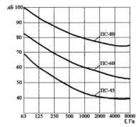 Перший метод нормування є основним для постійних шумів. Тут нормуються рівні звукових тисків в 8 октавних смугах частот з середньо-геометричними частотами 63; 125; 250; 500; 1000; 2000; 4000; 8000 Гц. Деякі граничні спектри показані на рис. 2., з якого видно, що із зростанням частоти допустимі рівні зменшуються. Наприклад: ПС-80, де 80 – допустимий рівень звукового тиску в октавній смузі з середньо-геометричною частотою 1000 Гц. Сукупність 8 допустимих рівнів звукового тиску називається граничним спектром.
