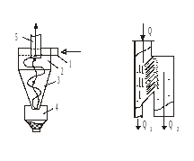 1 - вхідний патрубок; 2 - циліндрична камера; 3 - конічна камера; 4 – пилоосаджувальна камера; 5 - вихлопна труба Рис. 6. Жалюзійний пиловловлювач