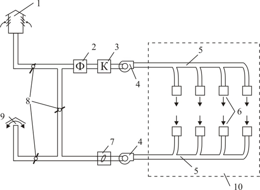 1 - повітрозабірна шахта; 2 - фільтр для очищення повітря від пилу; 3 – калорифер; 4 – вентилятор; 5 – повітроводи; 6 - припливні і витяжні отвори; 7 - пиловідділяючий пристрій; 8 - клапани; 9 - витяжна шахта; 10 – приміщення
